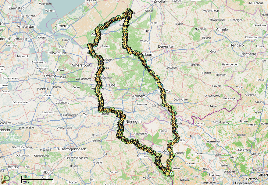 Aufgestanden um 05.00 Uhr am Samstag, wieder in die Falle um 02.00 Uhr am Sonntag. Eine sehr schöne Strecke, die ich schon zweimal gefahren war, auch als nördliche zweite Schleife des 600-km-Brevets von Twistedden aus, was ja ungefähr 1 km entfernt zur Grenze mit den Niederlanden liegt.