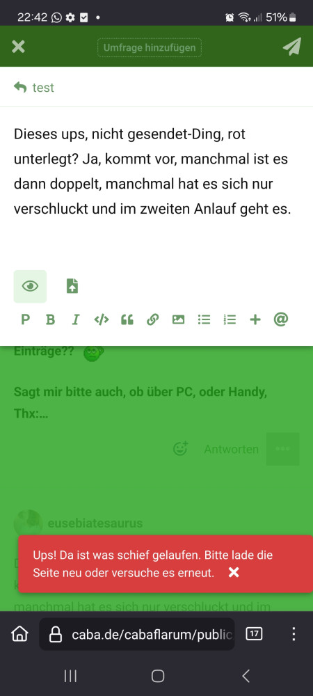 eusebiatesaurus Dieses ups, nicht gesendet-Ding, rot unterlegt? Ja, kommt vor, manchmal ist es dann doppelt, manchmal hat es sich nur verschluckt und im zweiten Anlauf geht es.
