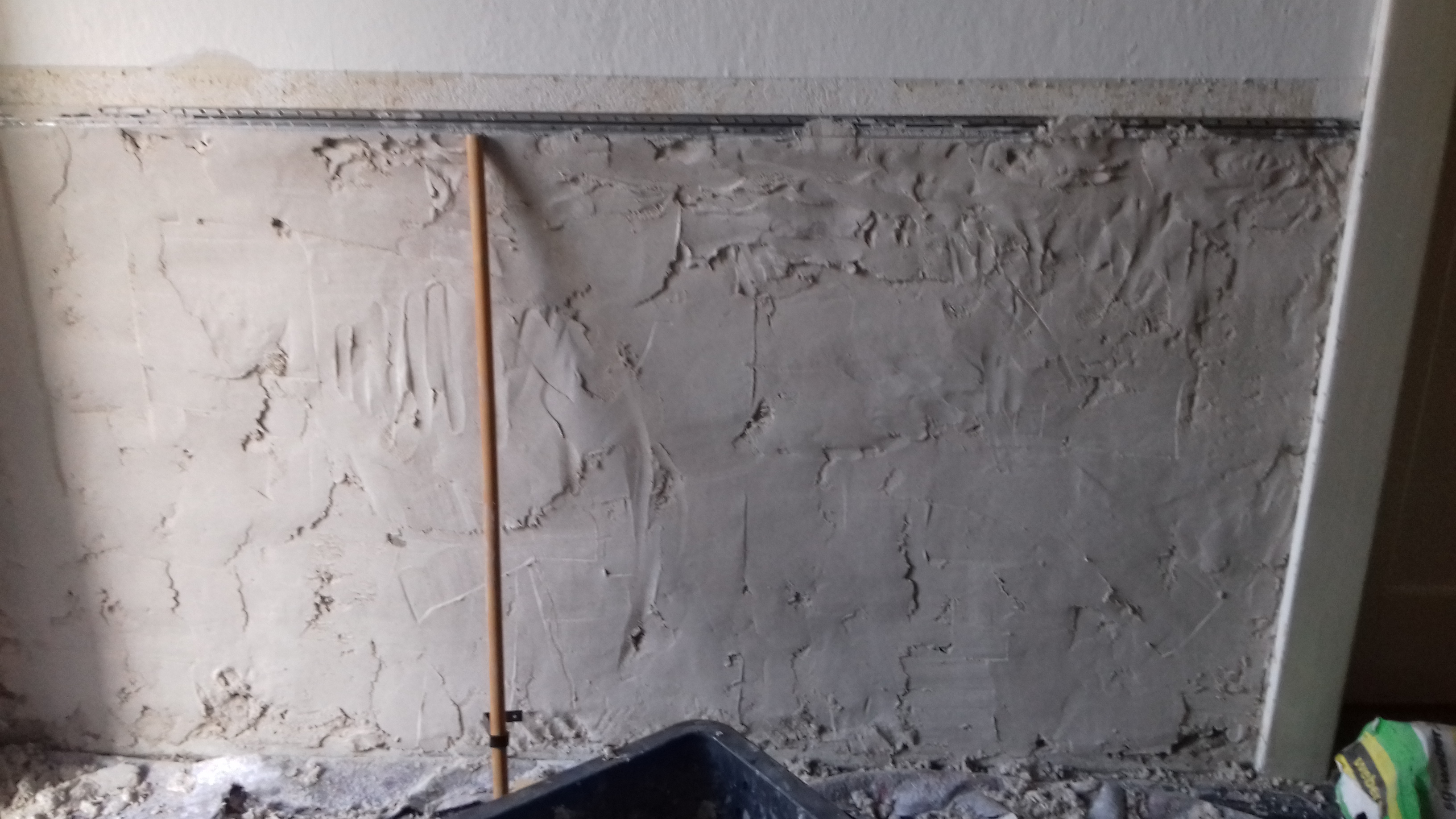 YESSS!!!! Ich gebe es zu, sie ist von perfekt so weit entfernt wie ich selbst von Diesels Einarmigem.... aber es ist MEINE WAND :hurra: Ich hatte ja sowas von die Hosen voll....größte Befürchtung war, ich klatsche dran und es klatscht wieder abwärts. So schlimm war es nicht, obwohl ich manche Stellen wirklich mit den Fingern reinkneten musste (leider hatten sich meine Handschuhe irgendwann verabschiedet, ich glaube, ich habe keine Fingerabdrücke mehr...). Es hinterher mit einer Leiste gerade ziehen konnte ich vergessen, dafür war 'der Schwung zu künstlerisch' und ich hätte es an den Fisselstellen wieder runtergeschabt. Also schön mit Schwamm geglättet- da kommt eh Lehmfarbe drauf, läuft also unter Ambiente :grins:Tja, und der blöde Wulst hätte oben nicht sein müssen, wenn da nicht diese tolle Schiene, die Donnerstag endlich da war, so blöde abgestanden hätte. Ich sollte sie 'leicht überputzen'...und mir ist nicht wirklich klar, wie sie den Zweck 'Ärger von neuem zu altem Putz' verhindern soll :gruebel: Egal, das muss jetzt so.