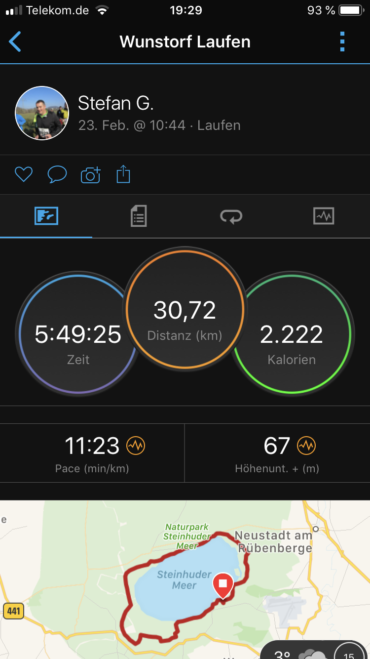 Ich war etwas enttäuscht, weil wir nur kurz an der Promenade gehen konnten, aber mit einem minimalenUmweg durch Steinhude konnten wir die abgebaute Brücke umgehen. Es war noch leicht frisch, aber unglaublich strahlend hell, ich habe die Sonne absorbiert wie ne Echse.Wir waren ziemlich langsam, aber zumindest gab es Zeit zum Quatschen. Ich habe immer mal etwas versucht, das Tempo hochzuziehen, der Suunto zeigte aber nie mehr als 4,6km/h... ich werde ihn mal an den PC schließen, in der Hoffnung,dass er sich updatet.