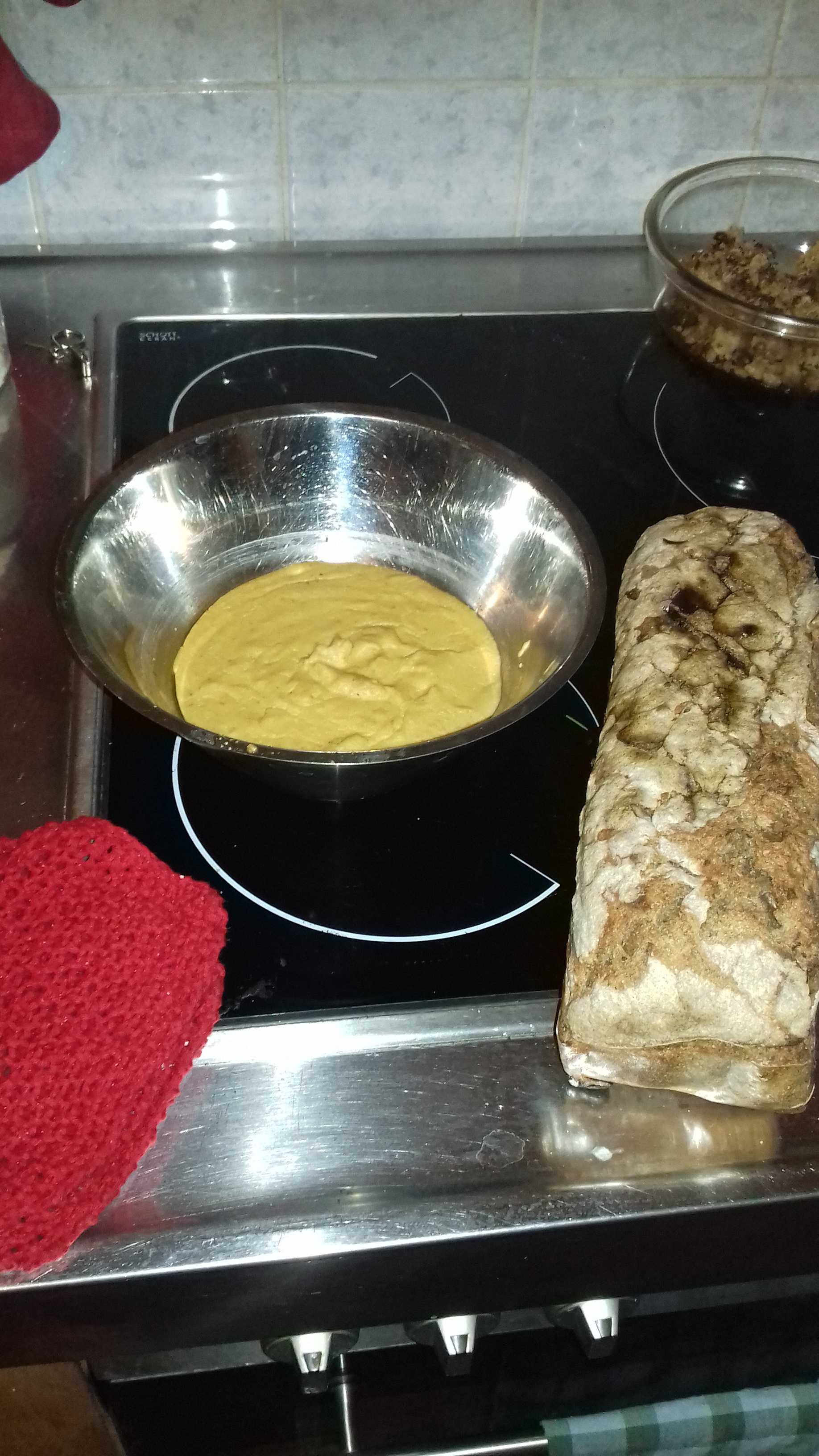 Da 2 EL Apfelmus ein Ei ersetzen können, habe ich die 6 Huhnprodukte mit 12 EL Apfelmus (selbstgemacht, logisch) getauscht. Weil schon Zucker darin enthalten ist, habe ich nur ca 100g genommen. Ebenso wurde das Öl reduziert auf ca 120ml, aber ich glaube, da geht noch weniger.
