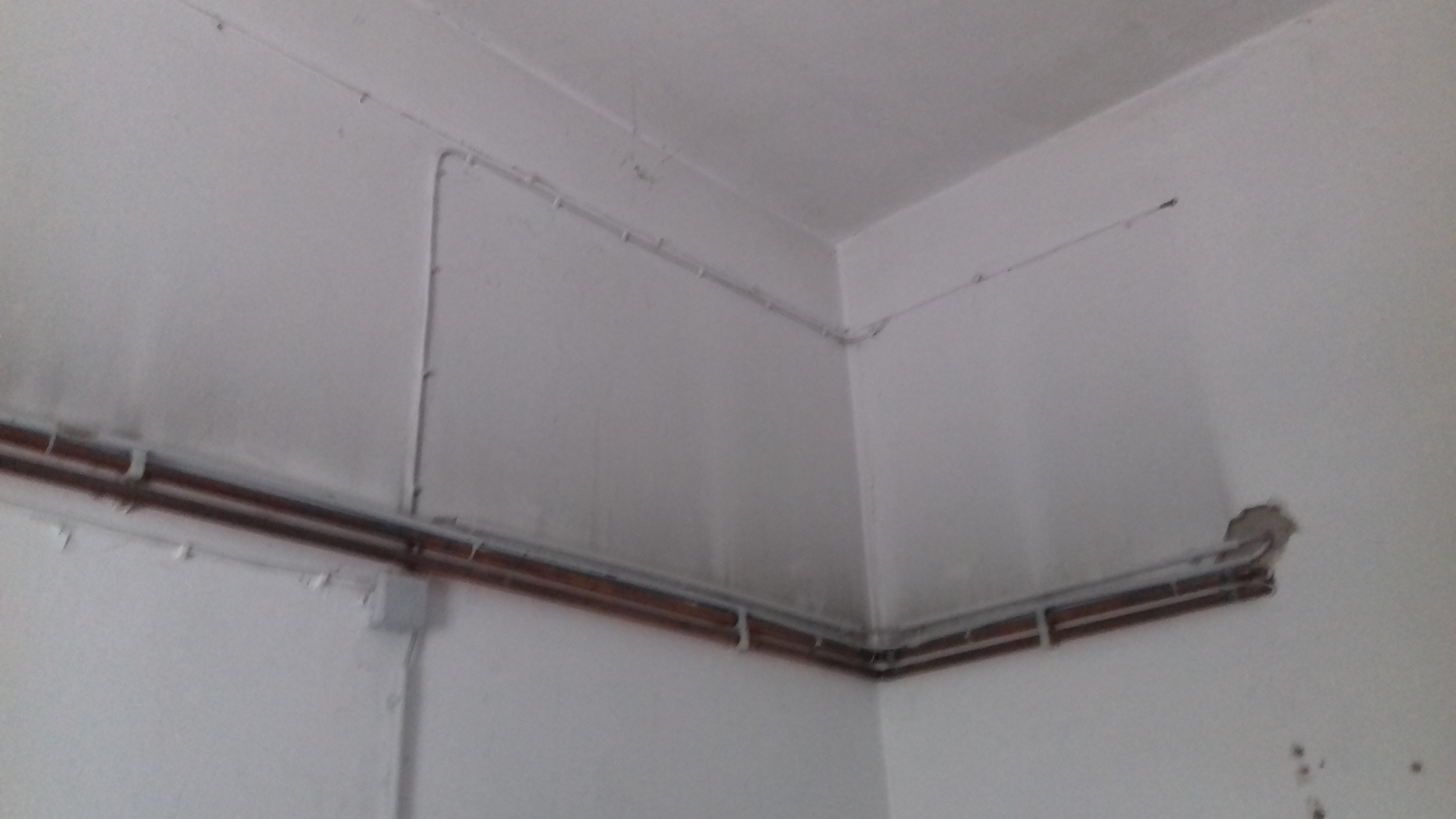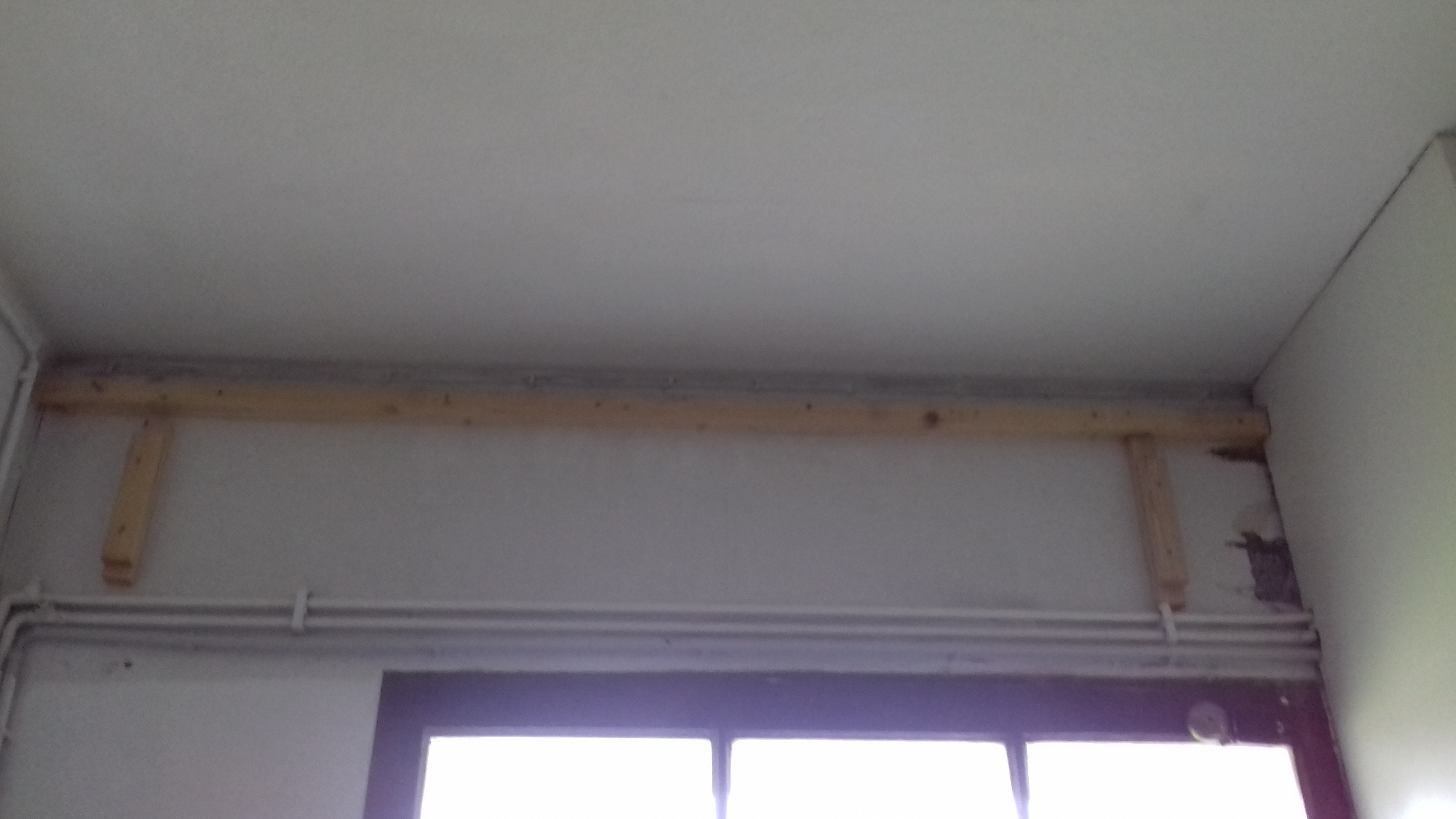 Hiervor hängen sonst gegen den Zug Vorhänge, hinter der oberen Platte und der rechten Platte über dem Stromkasten laufen die Leitungen (man sieht sie linksin der Ecke und oben an der linken Wand).