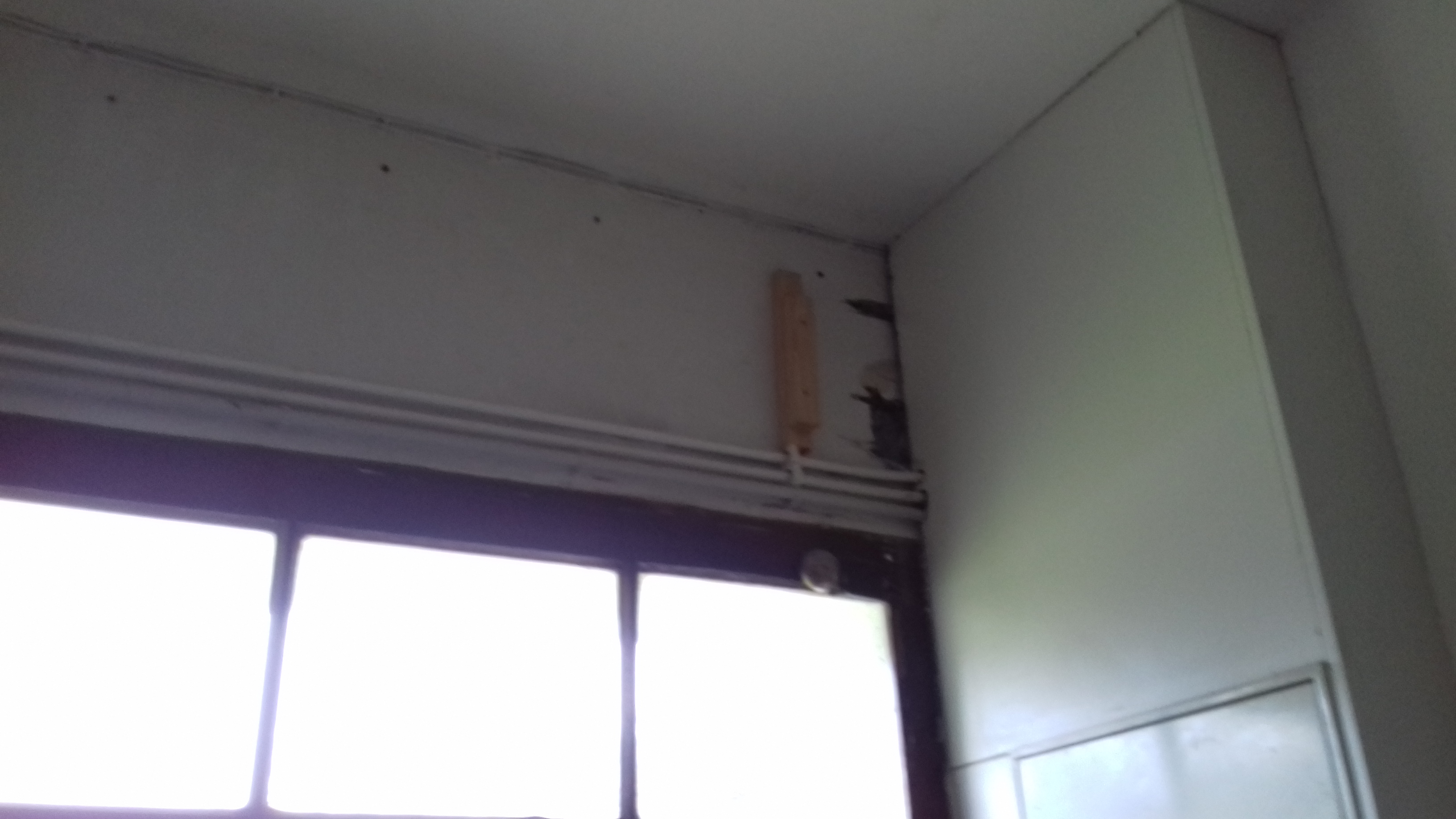 ...in 4 mHöhe...hier ist die Platte und die untere Latte schon abgenommen. Das Loch rechts war schon (unter der Platte versteckt) und man hat freien Blick auf Stroh/Lehm.