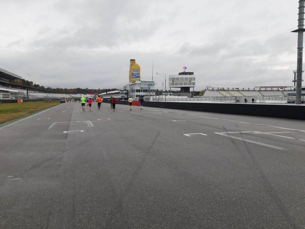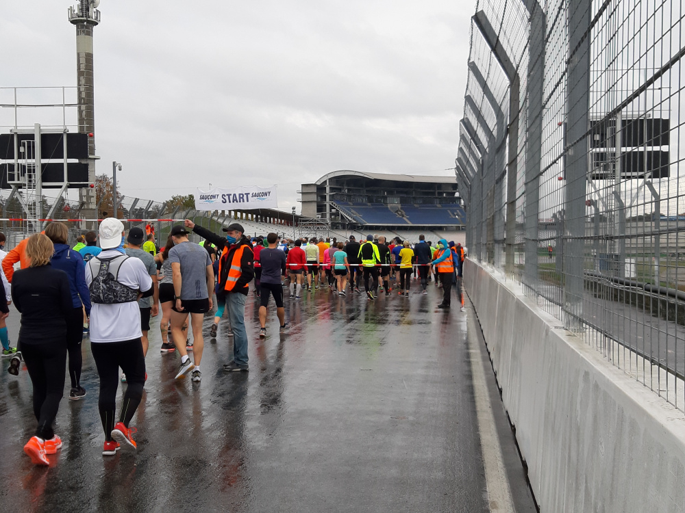 Der Start war 1km vor der eigentlichen Start/Ziellinie der Formel1 Strecke. Die einzelnen Startblöcke mit ca. 30 Läufern wurden alle 30 Sekunden losgelassen, ich sortierte mich recht weit hinten im letzten Block ein