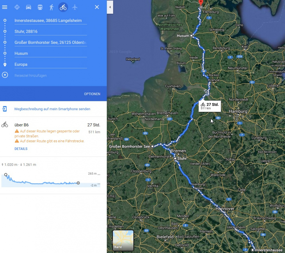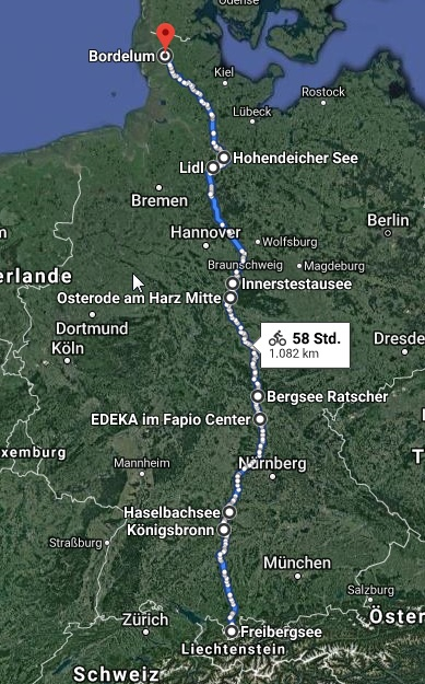 Radziel ist Bordelum (186km Rad, 153km Luftlinie). Dort wartet der Bus und zum letzten mal deine Laufschuhe.
