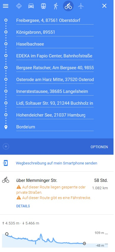 genannte Distanzen sind aus GoogleMaps kürzeste Route, die jeweilige Sportart Rad oder Lauf.