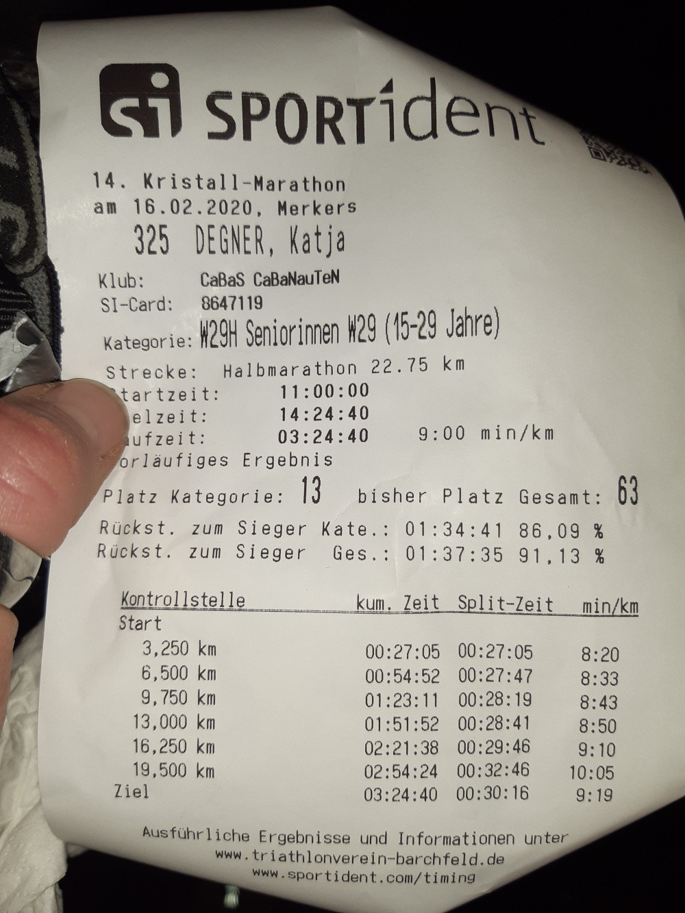 7 Runden musste ich und ich kam auch gut rein. Nachdem ich die Strecke verstanden habe, ließ ich einfach laufen, kam gut vorwärts und hatte Spaß. Oweh, jetzt kommen die Erinnerungslücken...ich meine, zu Beginn von Runde 3 hat mich Amplitude das erste Mal überholt (2 weitere Mal habe ich noch gezählt), zur Mitte kam Itchy und zum Ende (oder schon Runde 4?) Der Rest der Bande. Itchy kam ebenfalls zweimal vorbei, Pesthund habe ich immer erst verspätet realisiert, der ist einfach zu schnell :klatsch: Die anderen Cabas habe ich nur einmal getroffen, was aber an meinem Pitstop auf dem Klo gelegen haben muß (Runde 6). Shorty traf ich auch zweimal, mit Lima konnte ich etwas quatschen, bis er im Kielwasser von Amplitude und Itchy mitschwamm (nein, ich wollte dich nicht loswerden...aber auch nicht aufhalten :lol:). Richtig anstrengend fand ich Runde 5 und die letzte hatte es auch in sich...aber das kluge Zettelchen zeigte, dass ich da auch noch mal schneller war. Alles in allem bin ich wirklich zufrieden, ich bin ja unvoreingenommen rangegangen und habe nicht erwartet, in dem unbekannten Terrain so schnell zu sein. Heute habe ich einen ordnungsgemäßen Muskelkater in den Hüften, aber weil ich mich technisch konstant kontrolliert bewegt habe (Bauch fest, Atmung frei, Hüfte beweglich, Schub aber locker in den Beinen) hat mein Arschlochbein nicht unter dem harten Boden/den Gefällen gelitten.