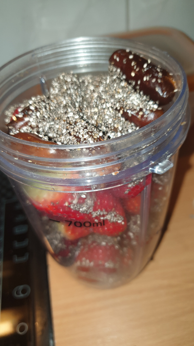Also Himbeeren, Erdbeeren, Datteln, Wasser... das ganze gut durchmixen und in den Kühlschrank...