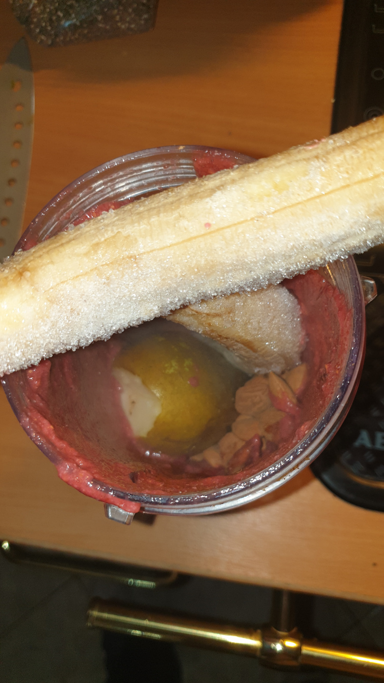 **Weil ich die ganze Restsauce nicht aus dem Mixer kratzen wollte, habe ich kurzerhand nen Schmoozi aus gefrohrenen Bananen, 1 x Birne, Datteln, Mandeln und Wasser gemacht... Lecker... :cooler: