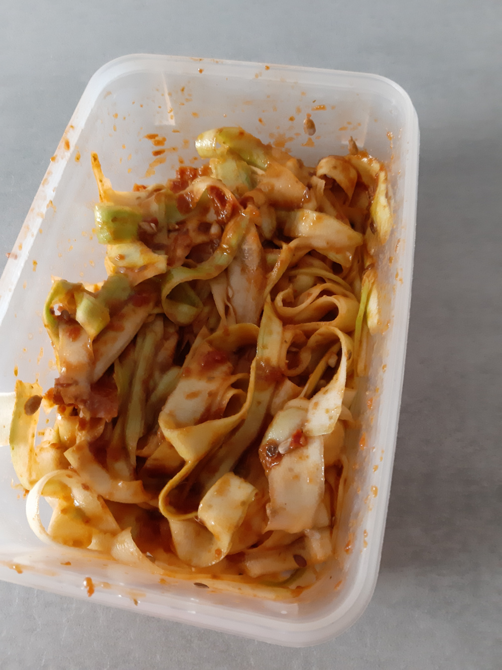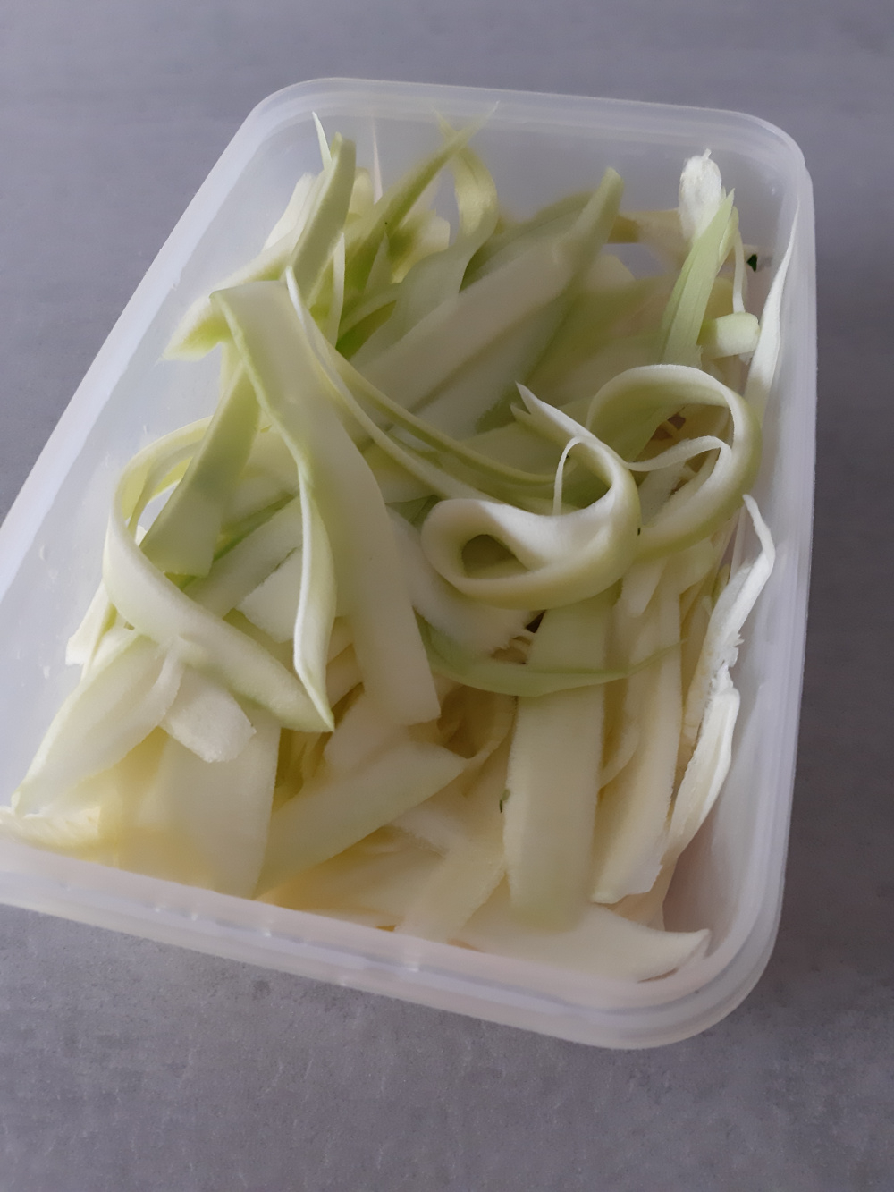 Einen Weißkohl in feine Streifen schneiden. Es vorher nicht mit dem abspülen übertreiben, lieber nur die äußeren Blätter entfernen. Ein großes Blatt aufbewahren.