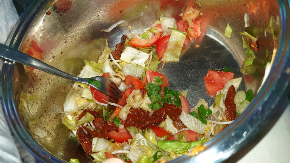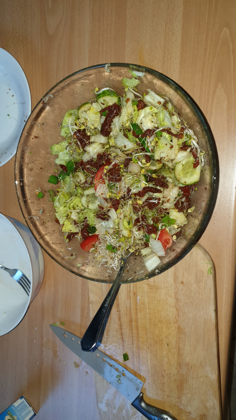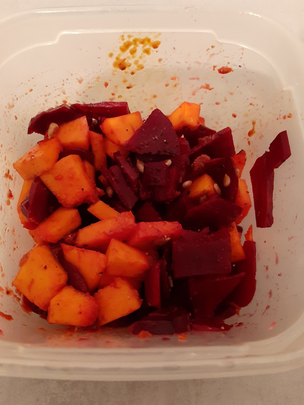 Alles klein schnippeln und mit dem restlichen Tomatenpesto vermischen. Geschmacklich eben genauso, wie man sich Rote Beete und Kürbis vorstellt... kann man aber mal machen