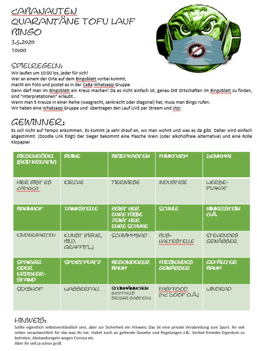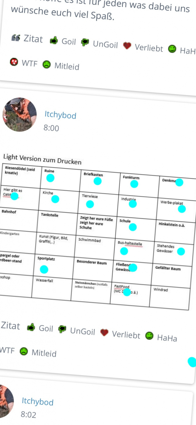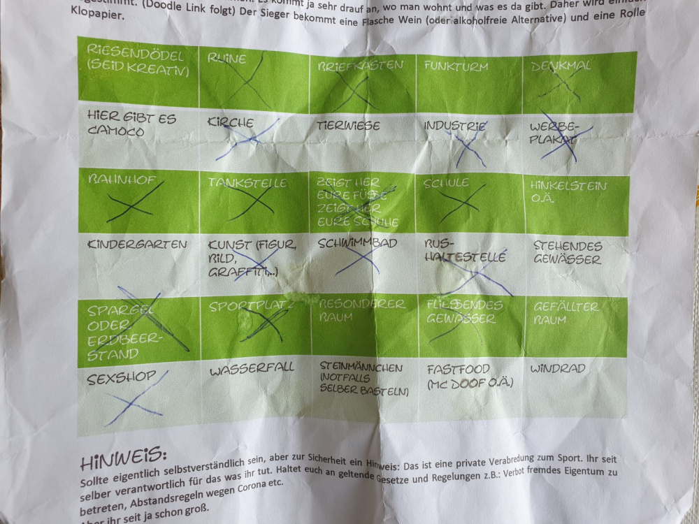 Itchybod Cool da waren ja schon zwei fleißig. Dann muss ich gleich mal weiter machen. Obwohl ich mich ja bei meinem eigenen Lauf disqualifizieren musste. Zum Fotografieren des Sportplatzes bin ich über eine gesperrte MTB Bahn gelaufen. Die Bahn war aber strengstens gesperrt. :kopfwand: Ich hoffe das da mal nächste Woche sinnvolle Lockerungen kommen. Spricht imho nix dagegen da jetzt Mountainbike zu fahren. Nachdem ich Honk das auch extra noch in die Ausschreibung schreiben musste, bin ich wohl raus. Aber es wäre ja auch blöd, wenn ich mir selber eine Weinflasche schenken würde. Aber trotzdem der Weg zu meinem ersten Bingo. 1. Zeigt her eure Füße, zeigt her eure Schuhe: 2. Denkmal <https://www.gedenkorte-europa.eu/content/list/542/> 3. Sportplatz (auf dem Weg zum Foto verbotenerweise über die Moutainbike Bahn gelaufen. 4. Spargelstand. 5. Kunst an der Waldorfschule 6. Als Industrie das Vivil Werk in Offenburg. Damit hatte ich mein erstes Bingo. Natürlich war ich auch noch am lokalen Sexshop. Hier noch mein gesamt Spielplan: Das war aber heute aber nix für mein männliches Gehirn. Auf dem Weg zum Schwimmbad an 3 Bushaltestellen und mindestens 2 Werbeplakaten vorbei gekommen. Ich war aber schon mal froh, dass das erste Bingo im Chat erst nach über 30 min kam. Ich hatte befürchtet, dass einer nach 5 min schon Bingo ruft. Es hätte einer ja neben einen Kindergarten mit Hinkelstein und gefälltem Baum wohnen können. Der Jitsi chat lief gut bei mir und hat mir Spaß gemacht. Für mich war dann aber erschwerend, dass mein Handy an der Schule auf den Boden flog und eine Ladung Lehm mein Klinken Anschluss für das Kopfhöhrer kabel verstopft hat. Ich hab es aber vorhin wieder retten können. Es hat mir auf alle Fälle Spaß gemacht. Ein paar Leute in Offenburg halten mich jetzt zwar für komisch. Ich würde mich auch wundern, wenn da ein Typ mit Plüschhut vorbei läuft und in sein Handy ruft: "Ich lauf jetzt noch zum Sexshop" :schaem: :lol2: Achso noch ein paar harte Zahlen: 15,68 km in 2h 8 min : 8:09 min/km Zum Ablauf. Ich würde gerne morgen Abend eine Doodle Abstimmung starten. Dazu bitte hier einen Beitrag erstellen.