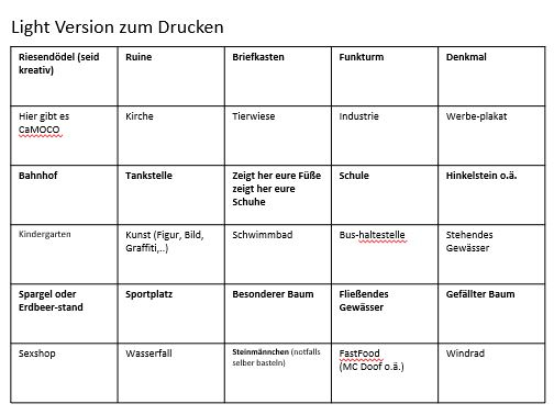 eusebiatesaurus <a rel="nofollow">Eusebia Tesaurus</a> schrieb:Ok, dann starte ich mal.... vielen Dank für die Ideen und die Orga :herz:CamocoaufnahmestationDorfkunstIndustrie (die bauen da Chirurgenbesteck, falls mal je.and Bedarf hat....)Burgerking an der B6...fester kann Food nicht sein ?Fließendes Gewässer Bushaltestelle UND Werbeplakat