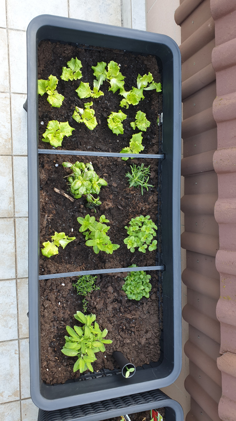 Also im Moment ist Koriander drin und der Salat. Itchy Frau zieht gerade indoor Tomaten und Kürbis. Ich denke die kommen dann raus.