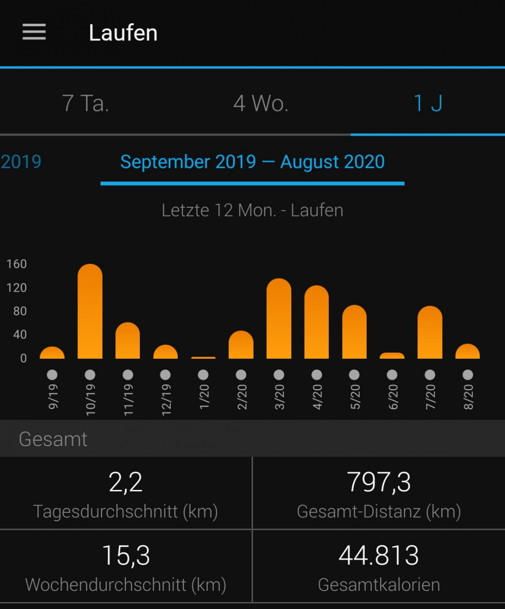 Hier ist mal meine Garmin Statistik aller Läufe in den letzten 12 Monaten vom Freitag vor der Challenge: