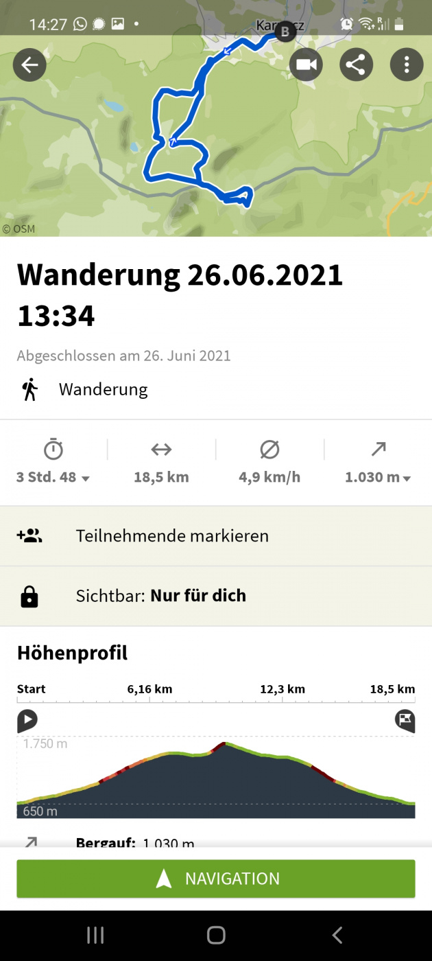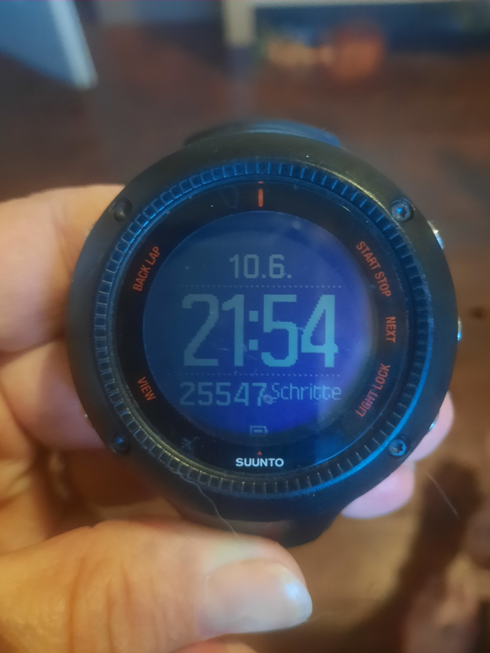 Oben angekommen nahm ich mir tatsächlich mehr Zeit als sonst. Ich hatte ja noch eine Mission. Es war eigentlich optisch kein schöner Platz (halt ein Platz mit Schotter), aber näher komme ich dem Himmel wohl nicht. Und er hätte es wirklich gut gefunden, da bin ich sicher. Also habe ich an einer kleinen Markiersäule das Bild meines Papas ausgelegt und musste natürlich (Anspannung, Anstrengung und ich bin ja eh recht brüchig am emotionalen Ufer) erst mal etwas vor mich hinheulen. Ein Mädel fragte dann auch bald "Are you ok?" :herz: Ja, war ich tatsächlich.Leicht im Kopf, es war heilend und ich hätte es sicher noch etas laufen lassen, aber dann hätten die sich alle Sorgen gemacht. Ausserdem war ich ja gleichzeitig überaus euphorisch, ich habe es tatsächlich gepackt :cooler: