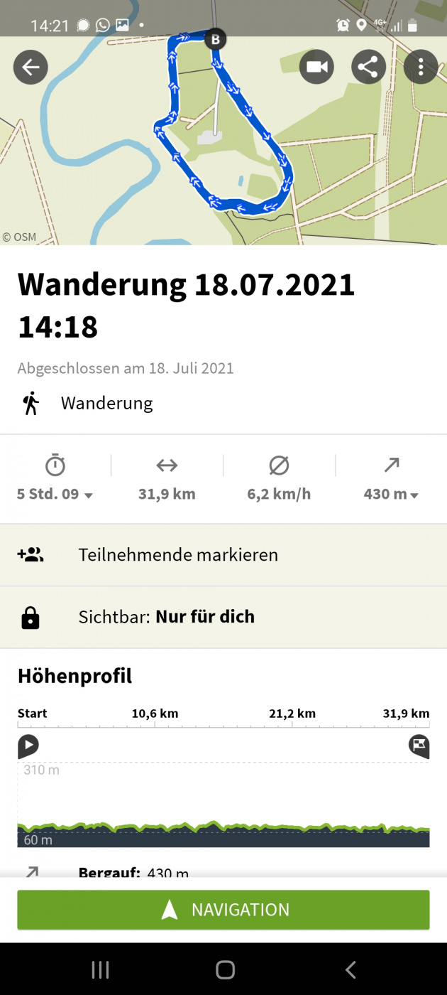 Dee Zeitmesser hatte 33 km gemessen. K. P. entweder hatte ich durch die Bäume zwischendurch schlechten Empfang, oder ich bin zuviel innen gegangen.