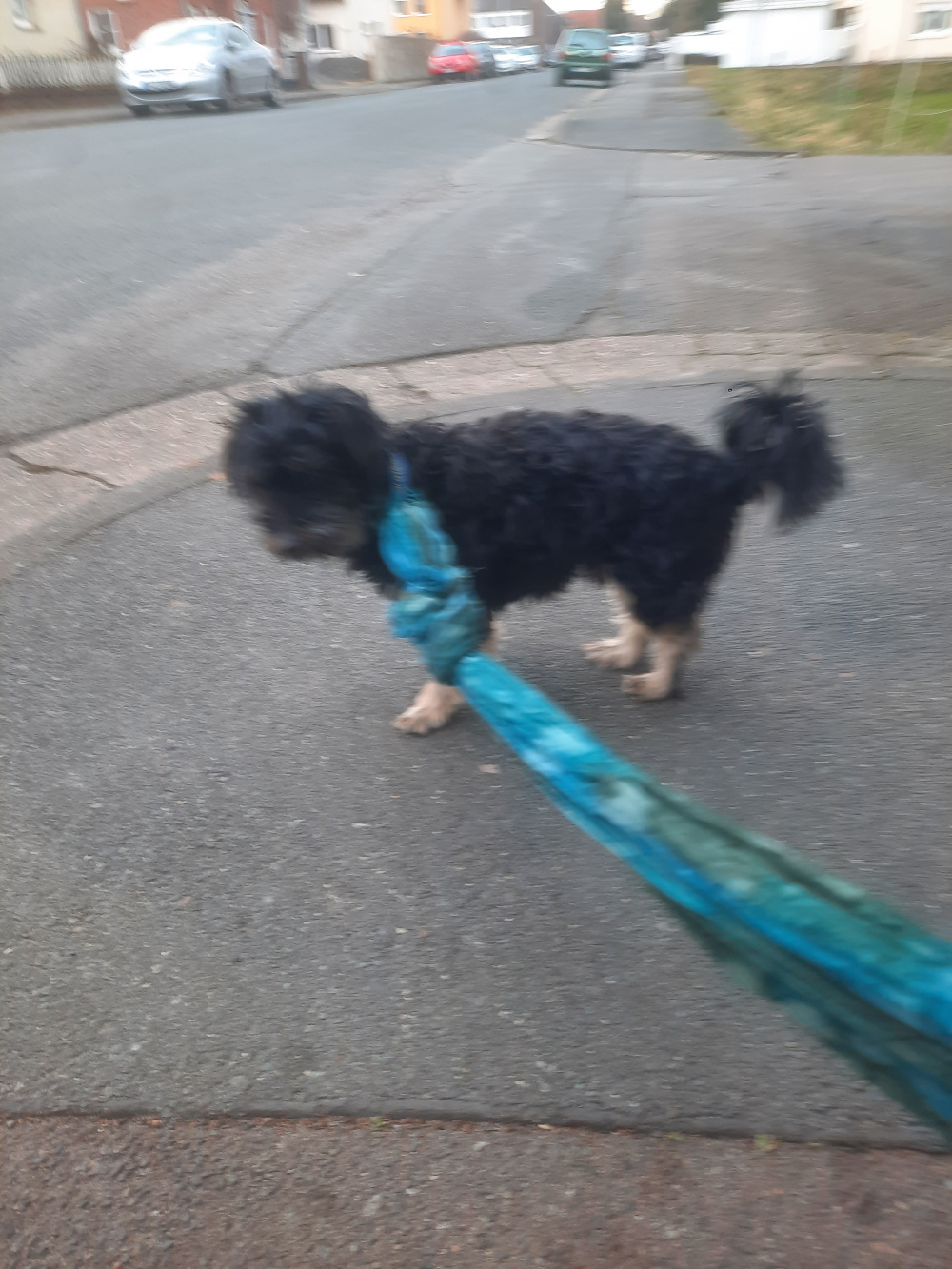 Ohne Leine aber dafür mit Halsband, auf dem der Name Tobi und die Nummer stand. Also angerufen und gewartet. Er fand uns nicht wirklich interessant, quetschte sich aber an mein Bein, als ich mich zu ihm gehockt habe. Irgendwann kam die Besitzerin angeschlörrt, meinte lahm, sie hätten das Fehlen noch gar nicht bemerkt. Nahm ihn auf den Arm, worauf er sofort loszitterte. Es war ein blödes Gefühl, da wegzugehen, aber so isses halt.
