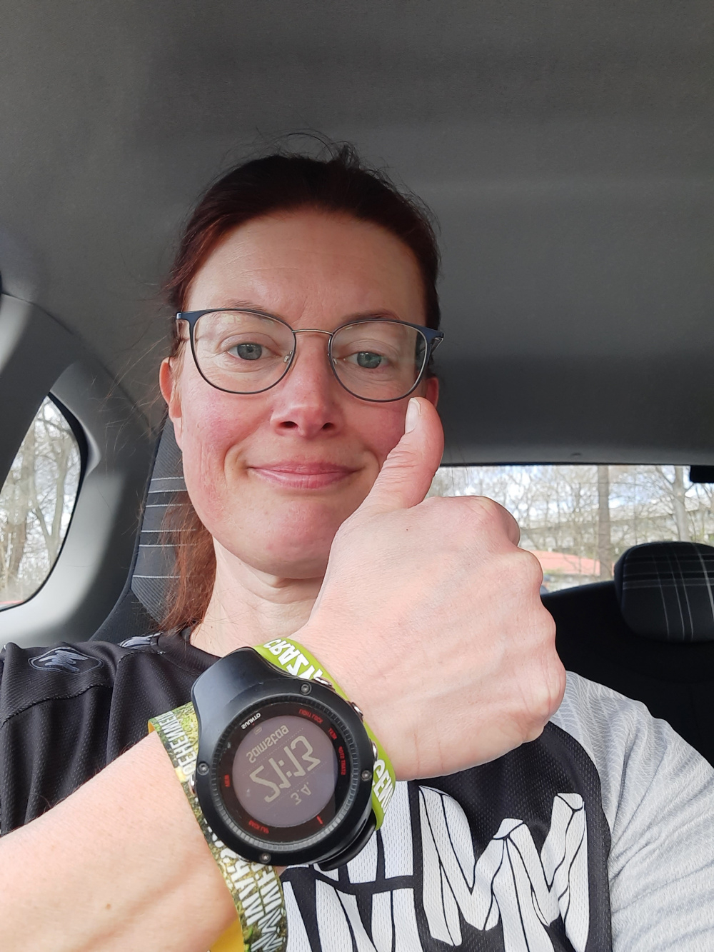 Ich schlug dann langsam den Weg Richtung Heimat ein und überlegte noch, ob ich nicht noch ein paar Kringel mache, um nicht zu früh da zu sein... da habe ich irgendwie versehendlich einen Punkt markiert, wo das Handy mich dann hinnavigieren wollte. Und ich habs nicht wegbekommen :kopfwand: Und mich auch nicht getraut, irgendwie rumzuprobieren- wenn jetzt die Aufzeichnung weg gewesen wäre :shock: Ok, dann hätte ich immer noch den Suunto gehabt...aber der hat ja wieder mehr als einen Km zuwenig gezeigt. Neenee, da war ich geizig. Also habe ich die Sprachhansage stummgeschaltet und versucht, die blauen Striche auf meiner schönen roten Linie zu ignorieren. Ich hatte dann auch zunehmend Lust, anzukommen :grins: Um die 42 voll zu machen, bin ich noch etwas die Straße hoch und runter gegangen. Ich hab kurz mit dem Gedanken gespielt, die 50 noch voll zu machen- aber vieleicht hätte ich mich dann doch noch geschrottet, und ich möchte ja morgen mit Justus noch eine Runde drehen.
