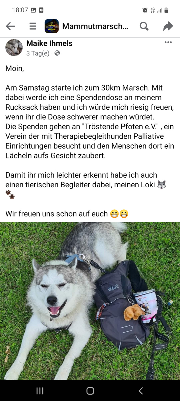 Am VP habe ich das Dixi aufgesucht und mir ein paar interessant aussehende Riegel (mit Kaffee :grins: ) und einen Apfel geschnappt, dann ging es gleich weiter. Kurz danach hatte ich die Möglichkeit, meinem Tiertourette nachzugeben- eine Frau mit einem wunderschönen Husky trug eine Sammelbüchse am Rucksack. Es ging um 'Tröstende Pfoten"; sie ist Krankenschwester und geht mit ihrem Therapiehund Loki (habe ich eure Aufmerksamkeit? :grins: ) auf Palliativstationen und in Altenheime.