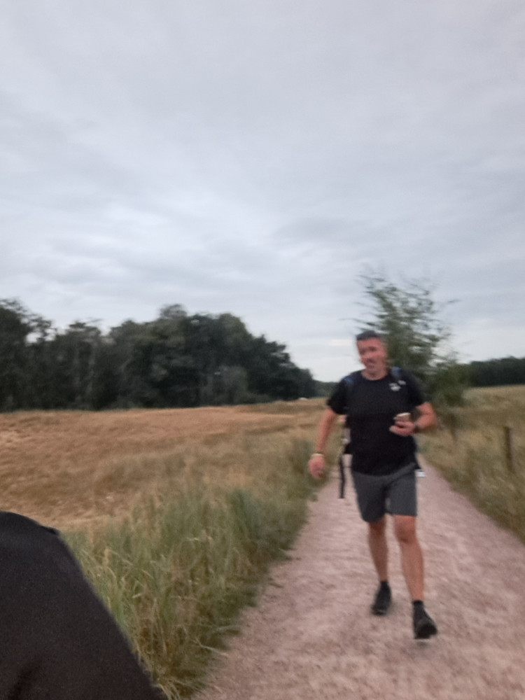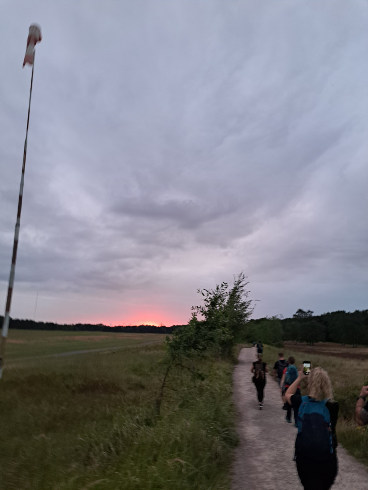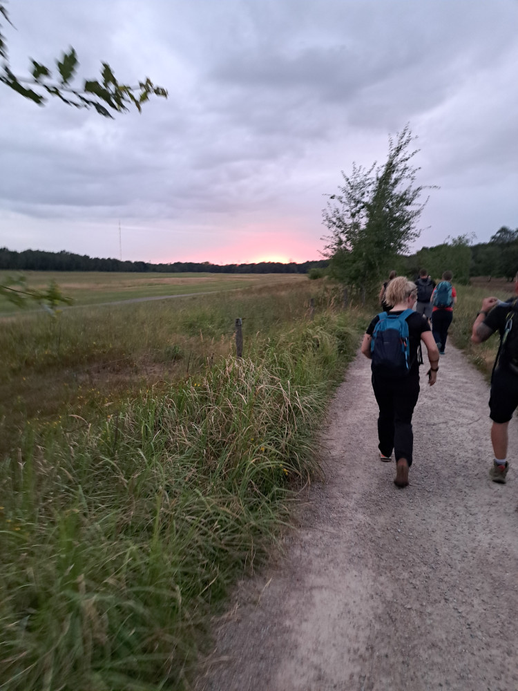 Wir kamen schön in die Dämmerung rein, ich meine, kurz nach dem 2. VP. Oder wars da schon dunkel? Egal. Jedenfalls waren wir gerade auf einem wirklich schönen Abschnitt, mit Wiesen, Birken, büschn Heide und so. Ich weiß nicht mehr genau, was ich schon geschrieben habe, vielleicht doppel ich mich. Wir kamen gut voran, immer noch so mit Marschtempo 6 km/h. Bei ca km 25 habe ich mir eine Ibu eingeworfen, weil sich die Muskulaturvom Arschlochbein verhärtete, darauf hatte ich keineLust. Und ich habe recht frühzeitig den Rucksack immer mal vorne getragen, um Nackenschmerzen vorzubeugen. Abgesehen davon lief es einfach. Kurze VP-Stopps, etwas Genörgel an meiner Seite über Stirnlampen, Stöcke, Ottoarme, whatever…aber ansonsten alles chic