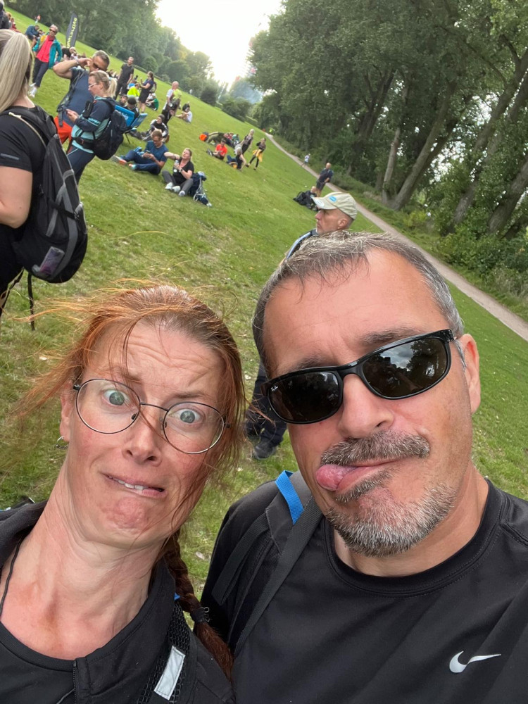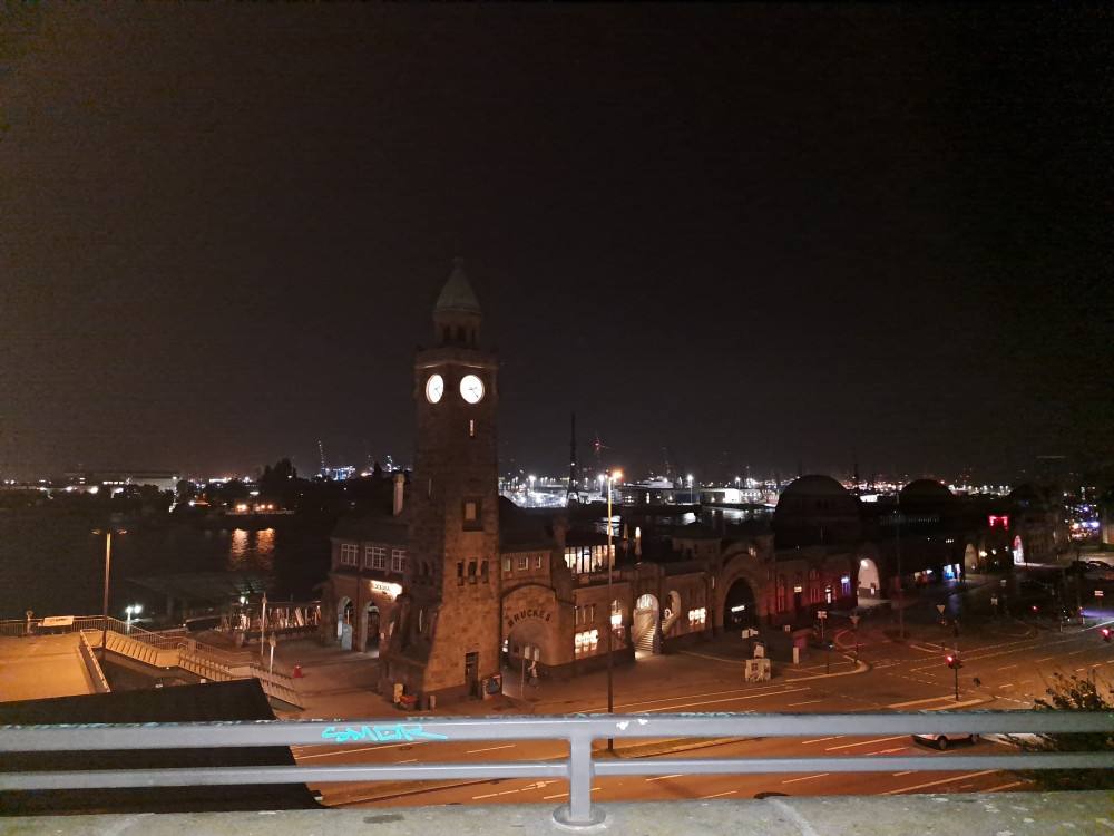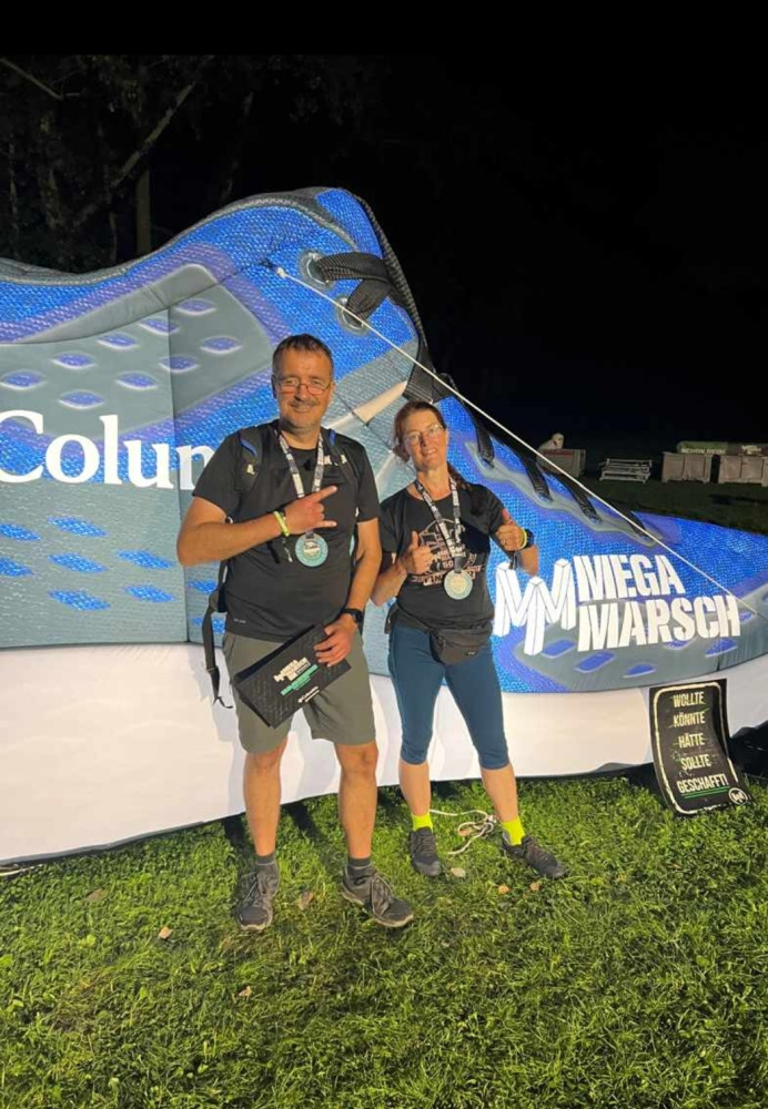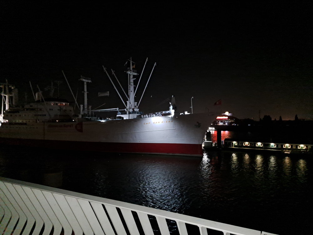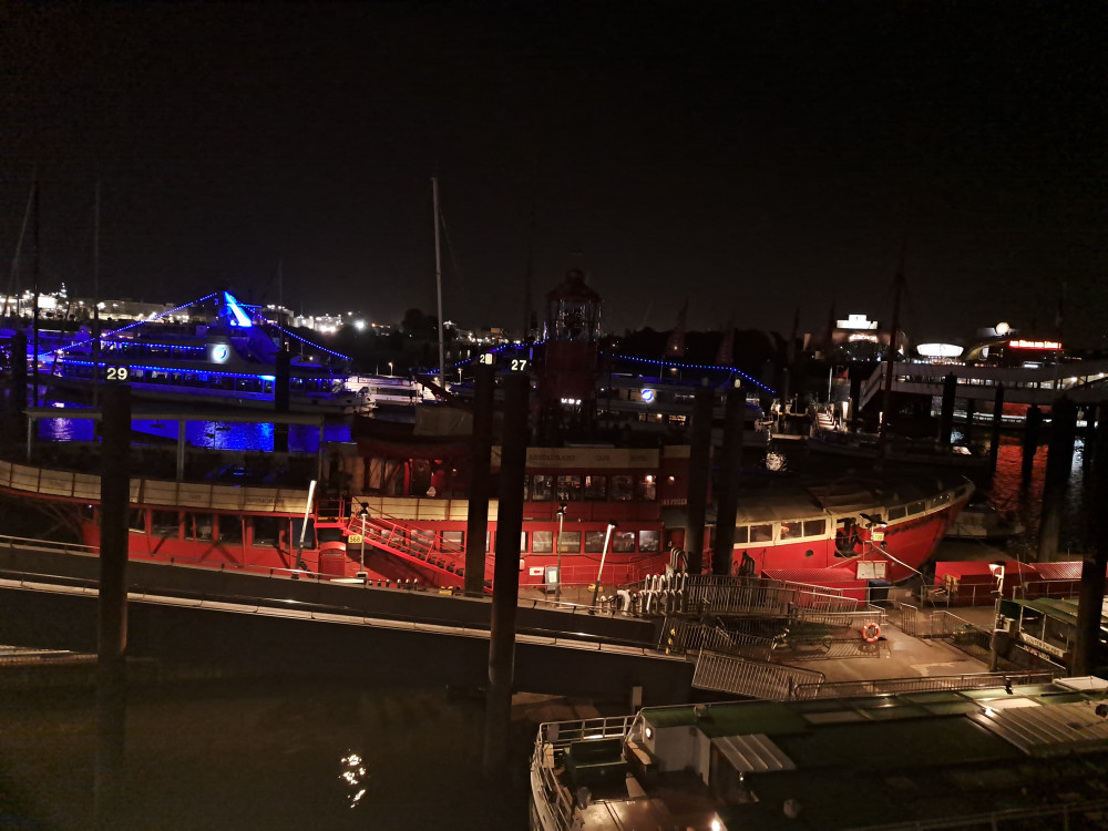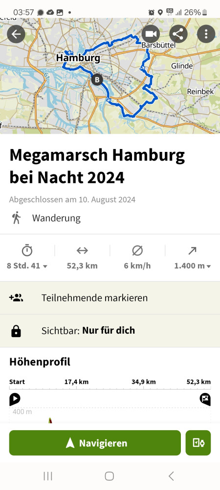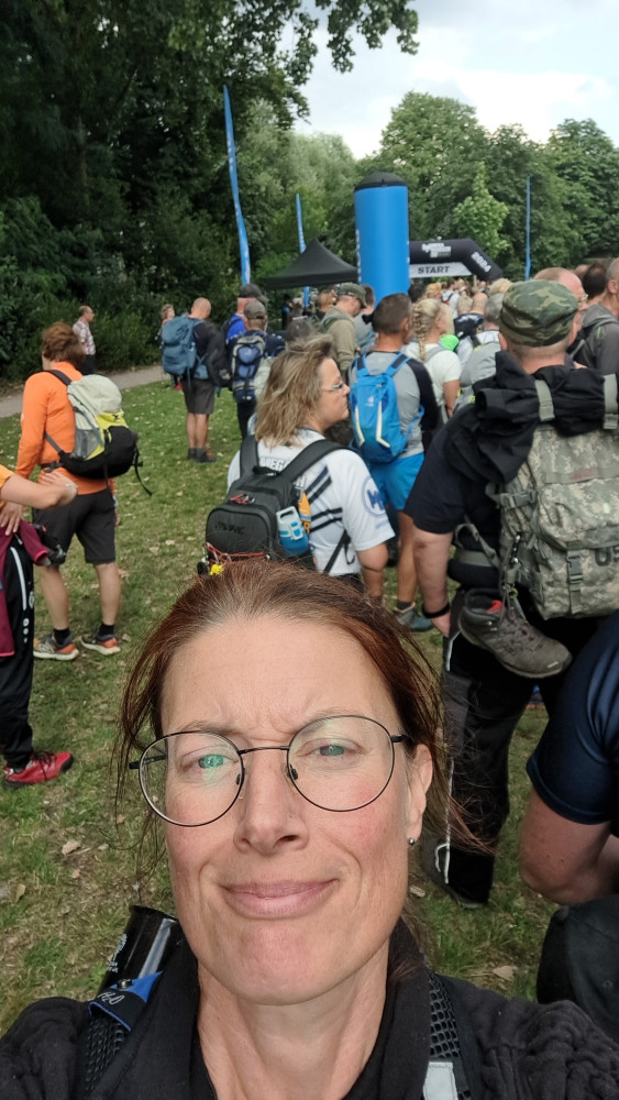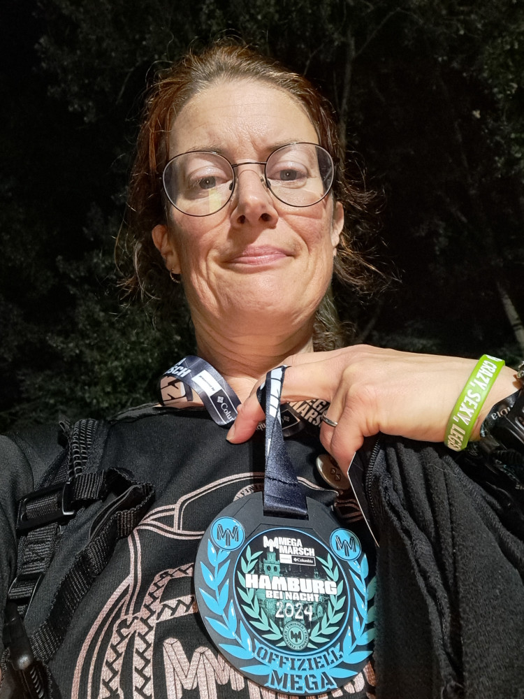 der letzte (?) VP war in irgend einer chicen Location, wo ich nach WCNutzung erst mal schwitzend, staubig und mit meinem bommelnden Emaillebecher (Megamarsch verzichtet schon eine Weile komplett auf Einweggeschirr) in eine Gesellschaft mit schönen jungen heiratenden Menschen geplatzt bin. Nun ja, wenn sie das anders hätten haben wollen, hätten sie eben Vorkehrungen treffen müssen, nach 40 km und nicht mehr ganz wach bin ich halt dümmer als sonst 😁Die letzten 10 wurden angegangen und esging durch einen TeilSpeicherstadt und am Hafen lang. Ich kam richtig in Euphorie; kennt ihr diesen Moment, wo in Hirn und Körper ploppt, dass man das Ding wirklich -und in diesem Fall auch gut- zuende bringen wird? Ich meine, das wird vorher nicht angezweifelt, aberich denke dann halt nicht drüber nach und bin auf den Moment fokussiert. Ich freute mich über den 'weißen Schwan'(die San Diego) und die Löweninsel, die ich vorletztes Mal mit der Lupine besucht habe. Die Rickmer Rickmers konnte ich nicht sehen, aber einige anderekleinere Schiffe. Es ging zum Abschluss noch ein paar Treppen hoch und wieder runter. Und plötzlich waren wir da, nach Gesamtzeit von 9Std22Min. Wurden freudig vom Moderator ins Ziel gejubelt und bekammen die Kloppervon Medaille, von der Grummi mir neulichschrieb, sie würden sogar im Dunkeln leuchten. Keine Ahnung, meine fährt bis zur Ablöse bei mir im Auto mit. Ich genoss meinen Zielkaffee (habe ich seit VP4 mit mir getragen)und Grummi ein Zielbier, dann trollten wir uns zum Auto und fuhren mit dem Sonnenaufgang Richtung Großburgwedel, wo ich in mein kleines Auto stieg.