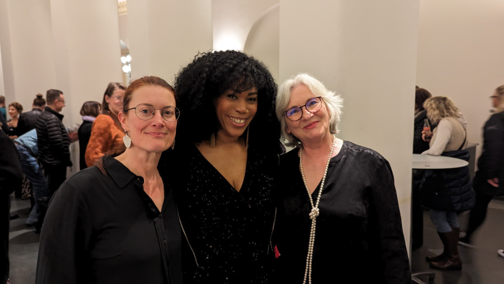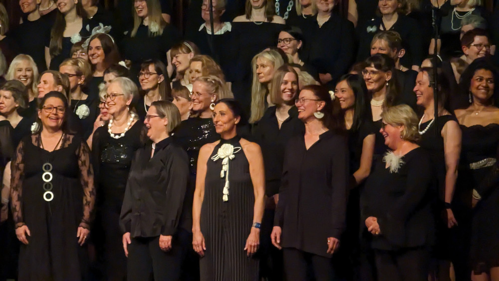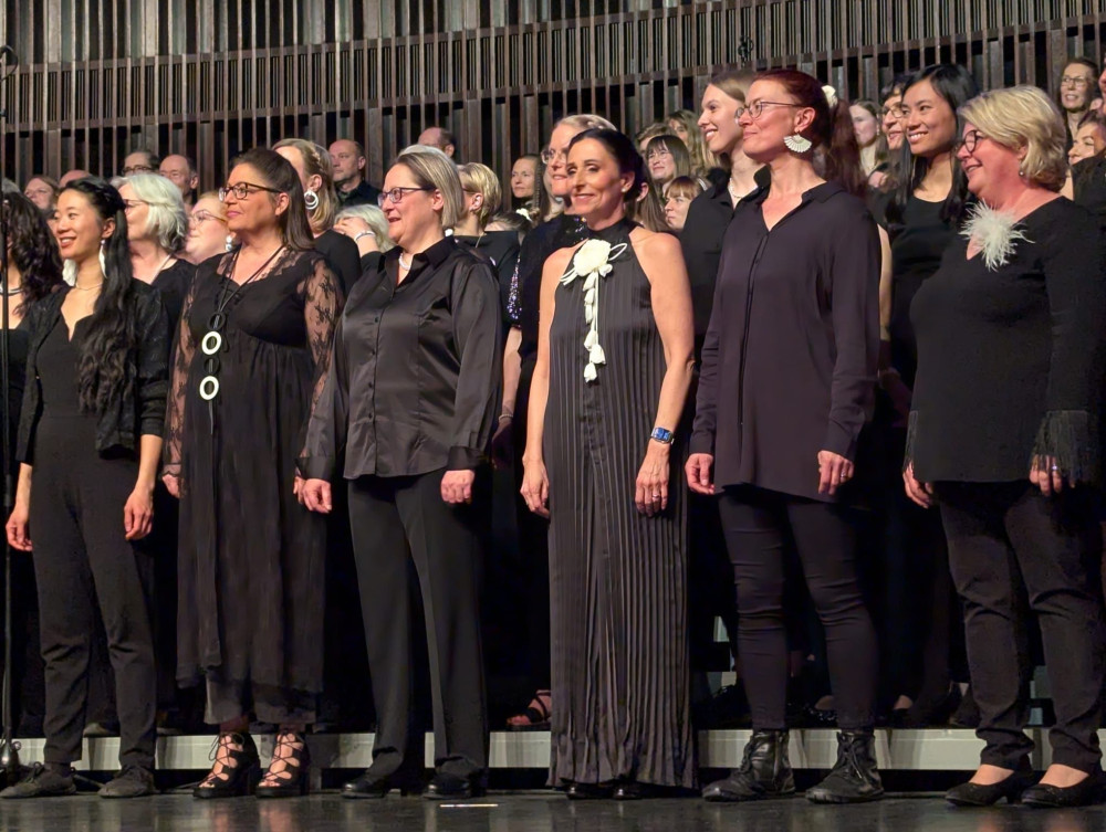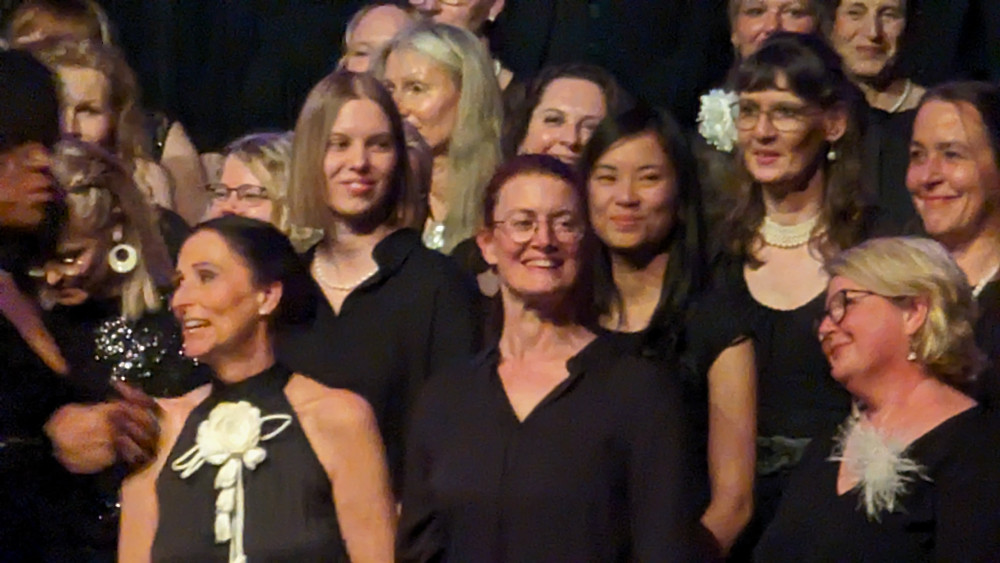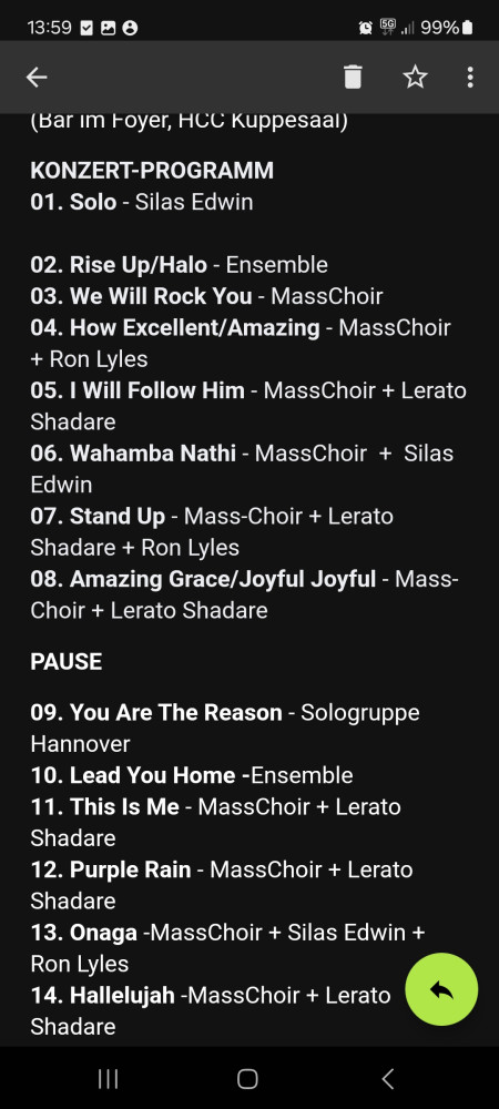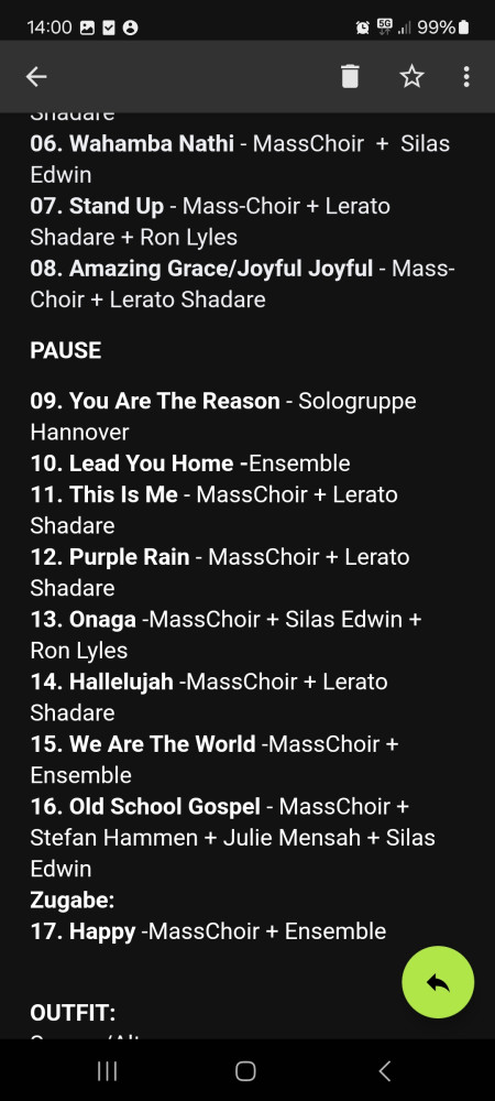 Samstag war die Generalprobe abends, d.h., ich war um halb elf zuhause. Sonntag Ankommen ab 14 Uhr, Buffetzeug aufgebaut und dann zog es sich etwas, bis wir um ca 15:20 mit der Stellprobe angefangen haben. Das bedeutet, im Prinzip das ganze Konzert durchsingen, manche Lieder zweimal- und das erste mal waren die beiden Solisten, die Band und das Stammensemble dabei. Es ging dabei nicht nur um 'wie klingt es' sondern auch um 'wie sieht esaus'. Und weil mein Platz in der ersten Reihe unter Vorbehalt war, war auch nix mit Schonen für später. Dann hatten wir ca 30 Minuten Zeit zum Umziehen und Durchatmen bzw Stimmpflege- und dann gings los! Silas, der Leiter und einer der beiden Dirigenten hatte einen Soloauftritt, den wir natürlich nicht mitbekommen haben. Dann gab es ein Lied von nem Solokünstler plus Ensemble und dann kamen wir. Das Warten war etwas kribbelig, allerdings nicht so schlimm wie befürchtet (früher musste ich vor Vorträgen immer stark auf meine Atmung achten, dassmir nicht schwindelig wurde.Yoga und Singen haben offenbar mehr gebracht, als gedacht