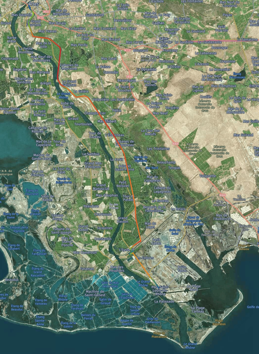 Die Teilung der Radwege in Becaurie ergibt schon fast wieder Sinn, denn in Arles teilt sich auch die Rhone selber. Die "Petit Rhona" fließt erstmal westlich, bevor sie ins Mittelmeer mündet und wird eben von dem anderen Radweg begleitet. Aber wenn ich schon Rhone fahr, dann natürlich auch die große! Ich folge weiter der Grand Rhone ans Meer.