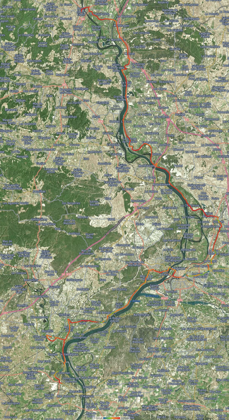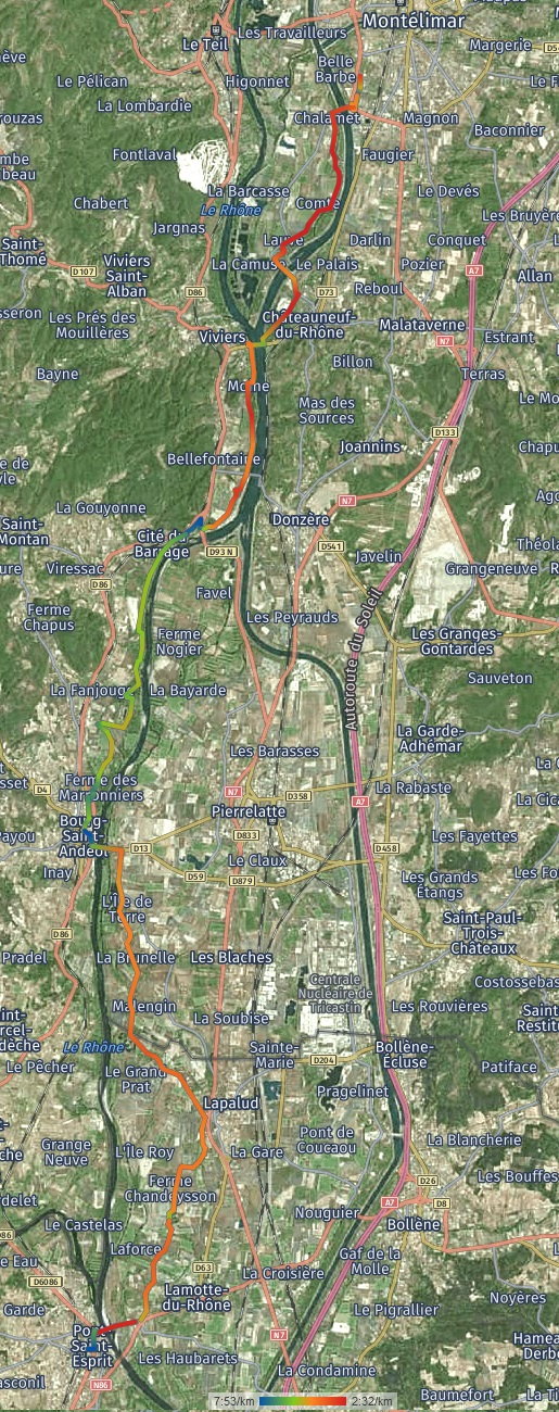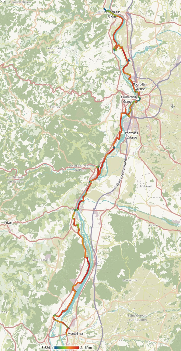 Die nächsten km ging es nur an einem Kanal entlang, irgendwie die schiffbare Variante der Rhone. Natürlich sind die Beine langsam schwer, aber überwiegend war es dort eine Kopfsache.