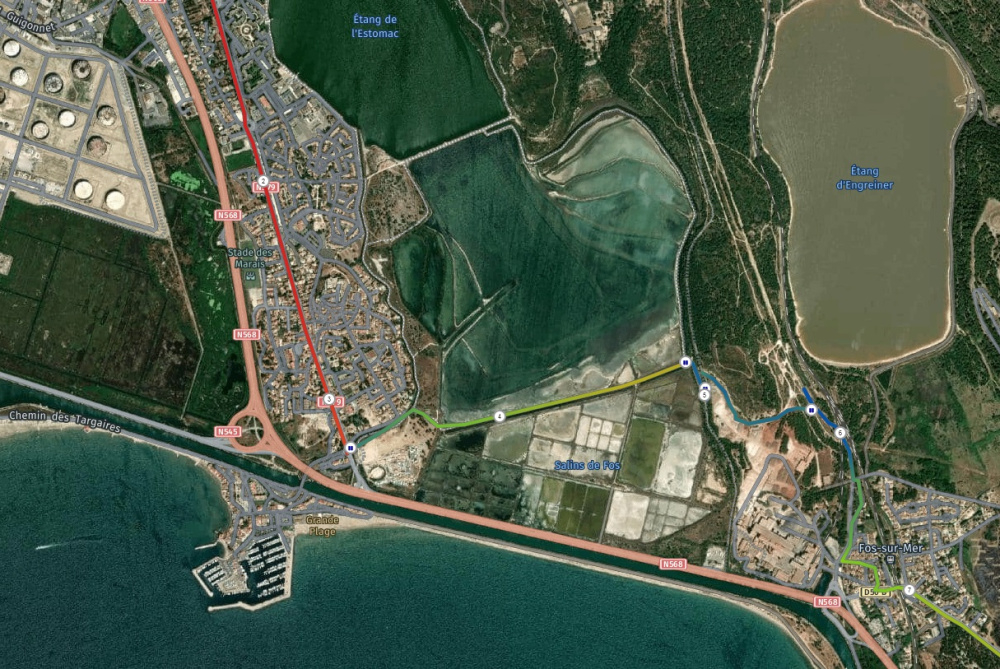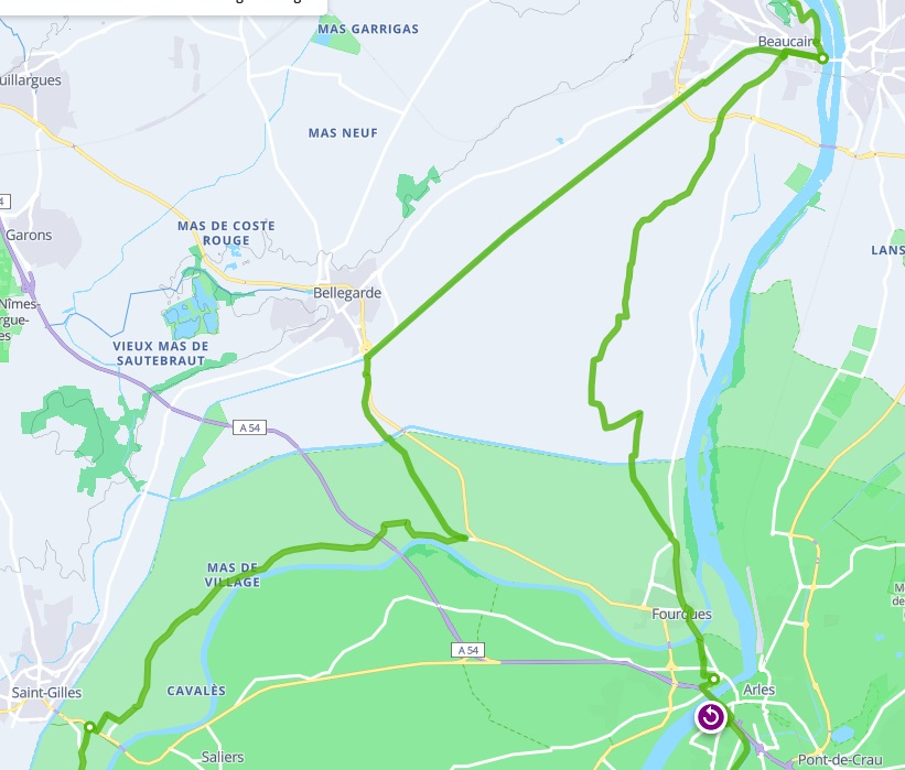 Ok, nochmal eine Nacht ohne Hotel wollte ich hier eher nicht verbringen und ich heute hab ich ja noch den halben Tag Zeit. Richtung Montpellier wäre die nächste Stadt Saintes Maries de la Mer, wo die kleine Rhone ins Meer mündet. Das wären 40km, aber mit zwei Fähren, und ich hab keine Ahnung wie die wann fahren... Also eher Richtung Marseille, dort wäre die nächste Stadt Fos sur Mer. Ins Navi eingegeben, und WTF?. Für die Luftlinie 6km berechnet mir mein Navi mal lockerflockige 197km und schickt mich zurück nach Arles, kann ja gar nicht sein!?