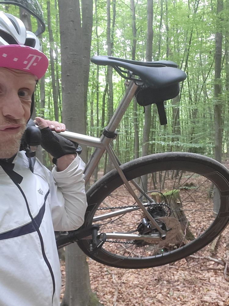 Ziel war null Druck auf Pedale und einfach so dahin Rollen. Das klappte auch Bombe aber beim Herman angekommen wurde mir die Fahrt auf der Straße nach oben verwährt mit der Aussage da oben ist eine Veranstaltung . Da ich aber ein Dickkopf bin durch den Wald wo ich wohl die wegbeschreibung des Passanten falsch verstanden habe also kurz den John gemacht und Rad getragen. Als ich wieder auf die Straße kam nächste Sperre aber der Security Mann war nett. Er meinte zu Fuß darf ich er j nur nicht Radeln aber wenn ich an Ihm vorbei bin kann ich ja wieder drauf steigen kann er ja dann nix dafür. Also ab hoch. Kurz Photo bissel umgeschaut wieder zurück. Navi hänger also erstmal falsche Richtung