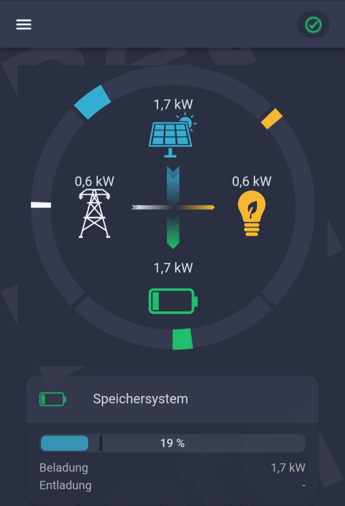 Heute morgen habe ich die Grenze wieder auf 25% gesetzt. Das System hat dann heute morgen das Haus über das Netz versorgt und den Strom, der vom Dach kam direkt in den Speicher geschickt.
