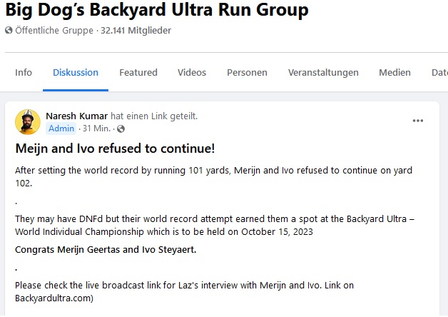 Das ist ja auch so eine Besonderheit vom Backyard! Du kannst nicht zu irgendeiner Veranstaltung fahren und sagen ich lauf mal eben 100Runden; du brauchst auch einen Bekloppten der genausoviel läuft...